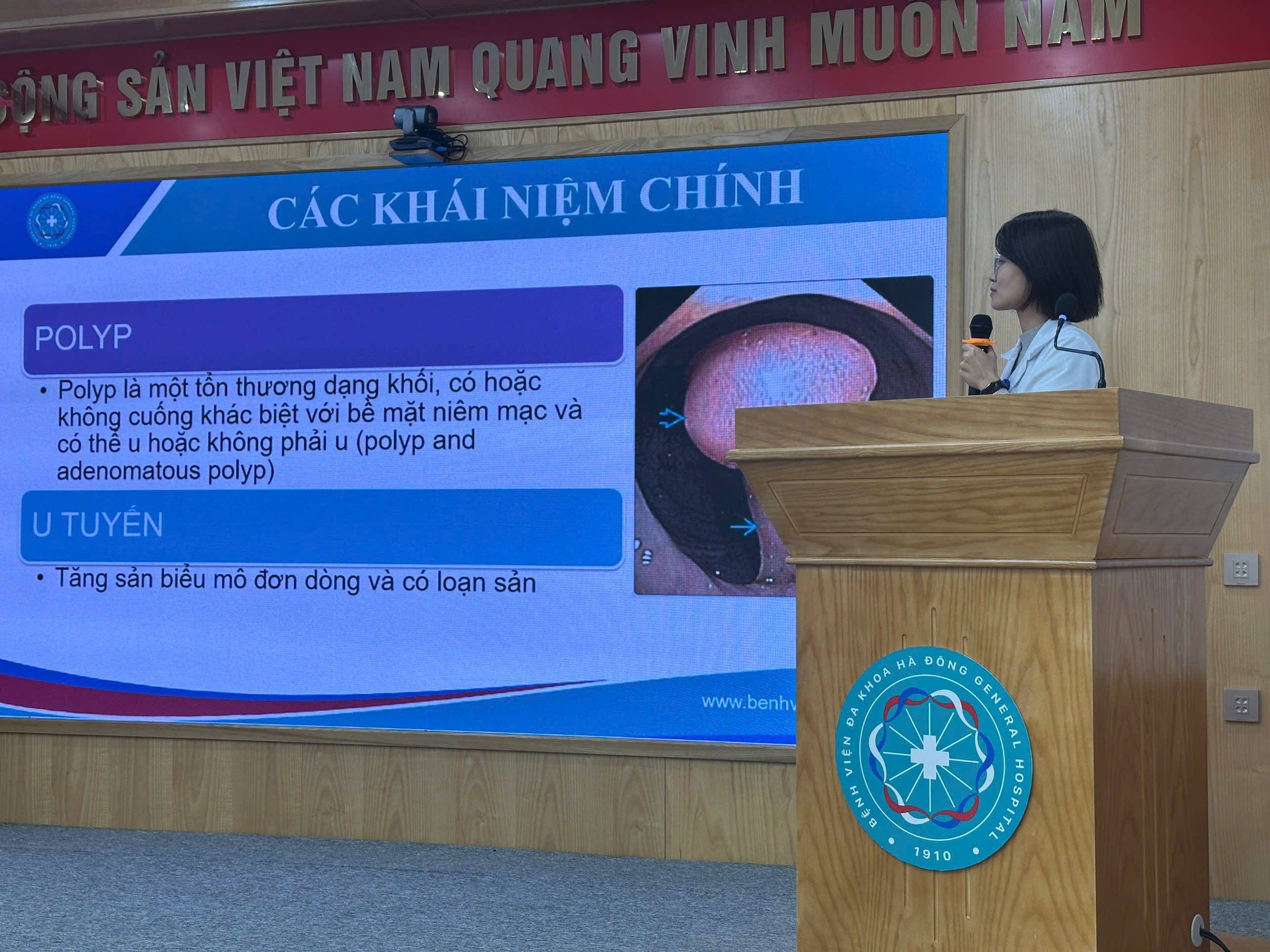 Báo cáo viên đã cung cấp cái nhìn toàn diện về đặc điểm mô bệnh học của các loại polyp đại tràng, nguy cơ tiến triển thành ung thư, cũng như vai trò quan trọng của tầm soát và chẩn đoán sớm. Những kiến thức được chia sẻ không chỉ giúp đội ngũ y tế hiểu rõ hơn về cơ chế hình thành và phân loại polyp mà còn hỗ trợ nâng cao chất lượng phối hợp lâm sàng – cận lâm sàng trong phát hiện và điều trị các bệnh lý đại tràng.