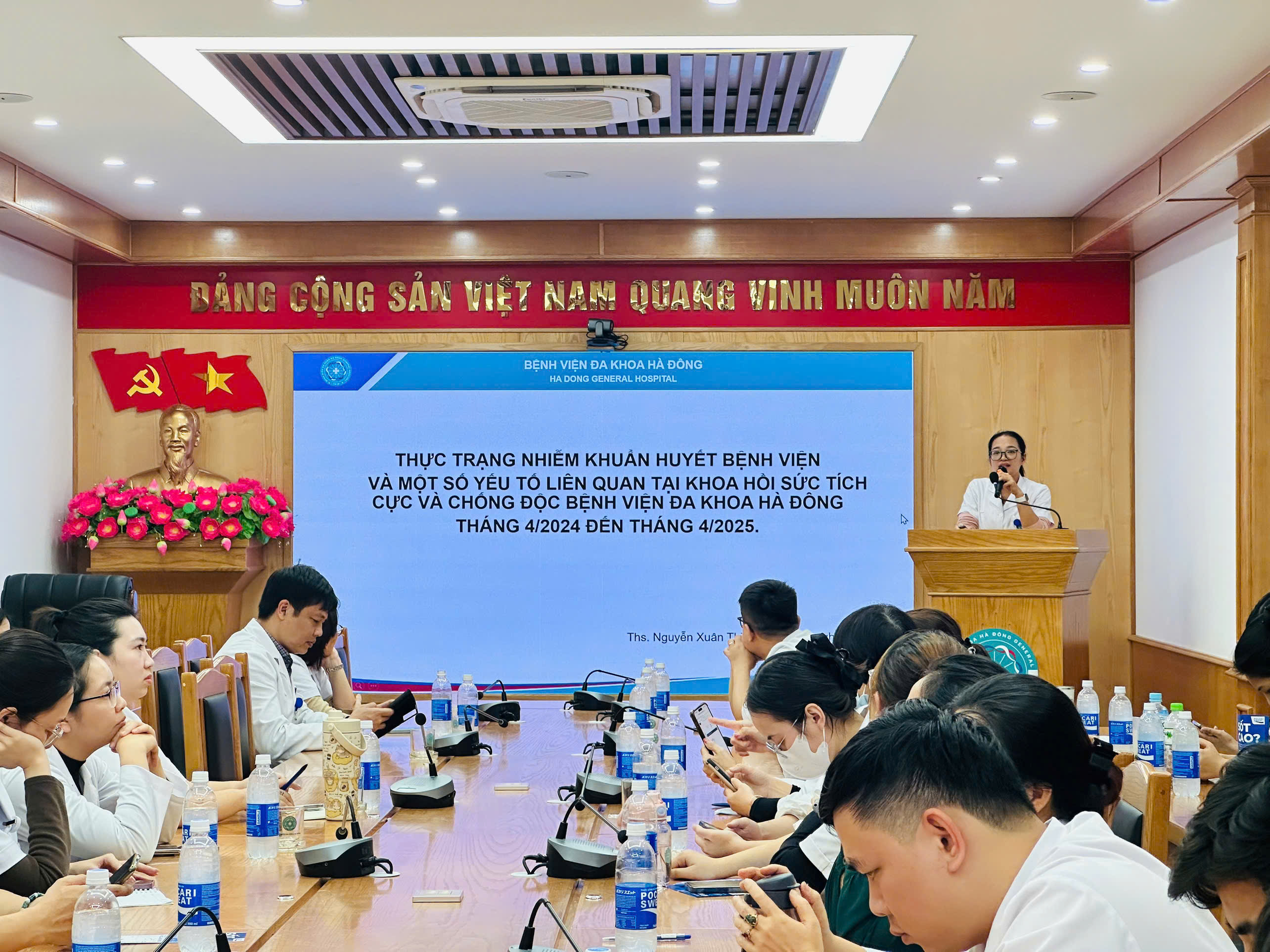 Tiếp nối buổi sinh hoạt khoa học, BSCKI Phạm Thị Thương – Phó trưởng Khoa Kiểm soát nhiễm khuẩn đã trình bày báo cáo với chủ đề: “Thực trạng nhiễm khuẩn huyết bệnh viện và một số yếu tố liên quan tại Khoa Hồi sức tích cực và Chống độc – Bệnh viện Đa khoa Hà Đông (04/2024 – 04/2025)”. Báo cáo đã phân tích tình hình nhiễm khuẩn huyết tại đơn vị hồi sức, đưa ra các số liệu đánh giá tỷ lệ mắc, các yếu tố nguy cơ và mô hình vi sinh gây bệnh. Đồng thời, nhóm báo cáo cũng nhấn mạnh tầm quan trọng của việc tuân thủ quy trình vô khuẩn, giám sát nhiễm khuẩn thường quy và tăng cường các biện pháp phòng ngừa nhằm giảm tỷ lệ biến chứng và cải thiện chất lượng điều trị tại khoa Hồi sức.