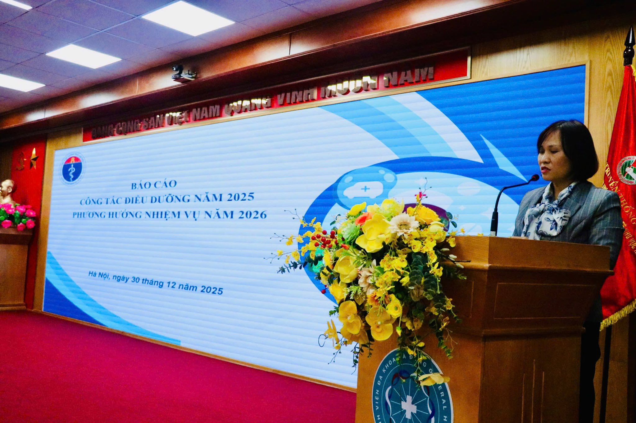 Th.S Điều dưỡng Tưởng Thúy Hằng - Phụ trách công tác Điều dưỡng Sở Y tế Hà Nội báo cáo kết quả hoạt động công tác điều dưỡng năm 2025 của ngành y