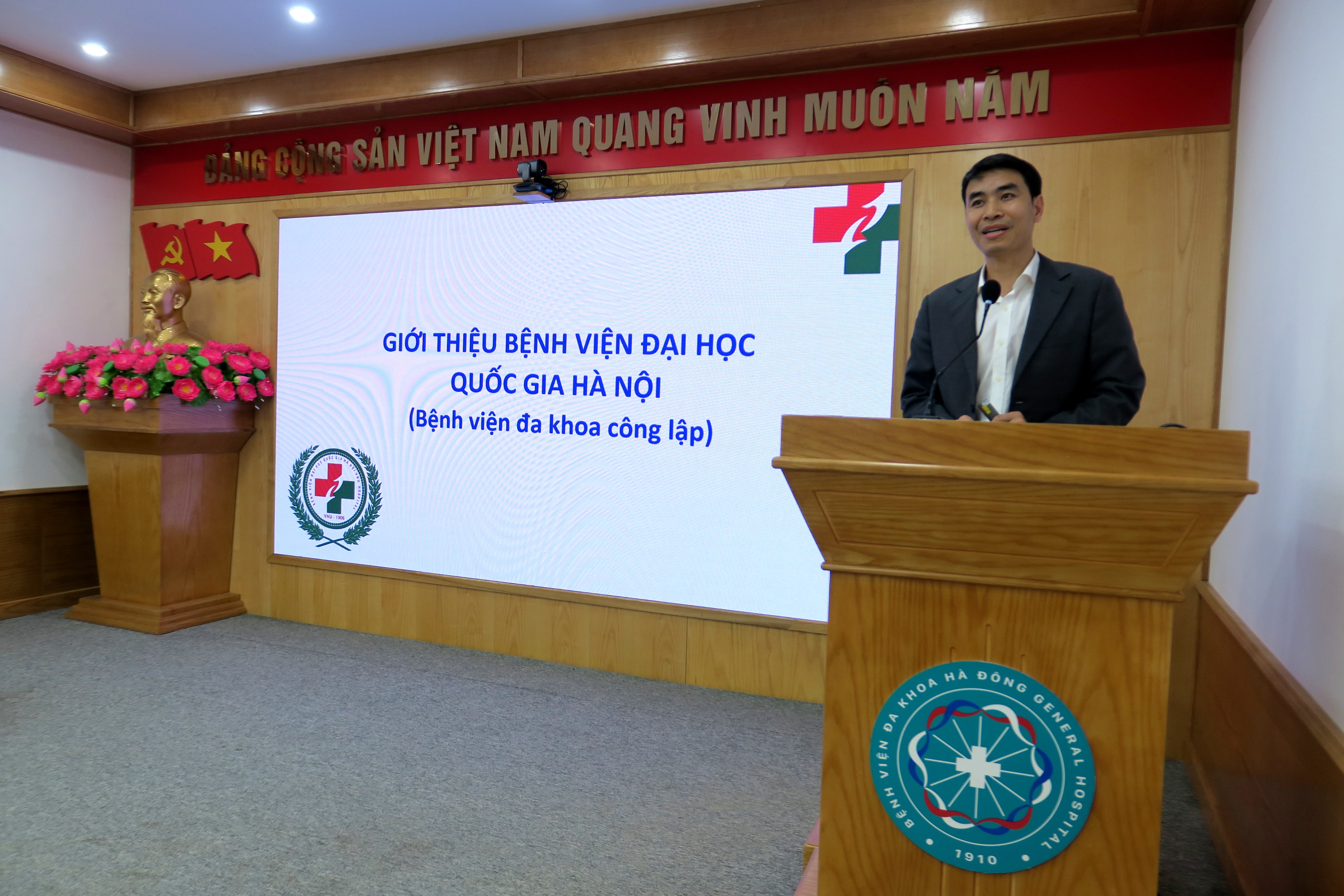 Cùng với đó, ThS. Đinh Quang Huy – Trưởng Phòng Kế hoạch Tổng hợp đã thay mặt lãnh đạo Bệnh viện Đại học Quốc gia Hà Nội trình bày quá trình phát triển Bệnh viện, và các lĩnh vực mũi nhọn. Đặc biệt, qua nhiều năm phát triển, Bệnh viện cũng đã đạt được nhiều thành tựu tích cực, với hơn 250 cán bộ, nhân viên và mỗi năm khám, chữa bệnh cho hàng trăm nghìn lượt người.