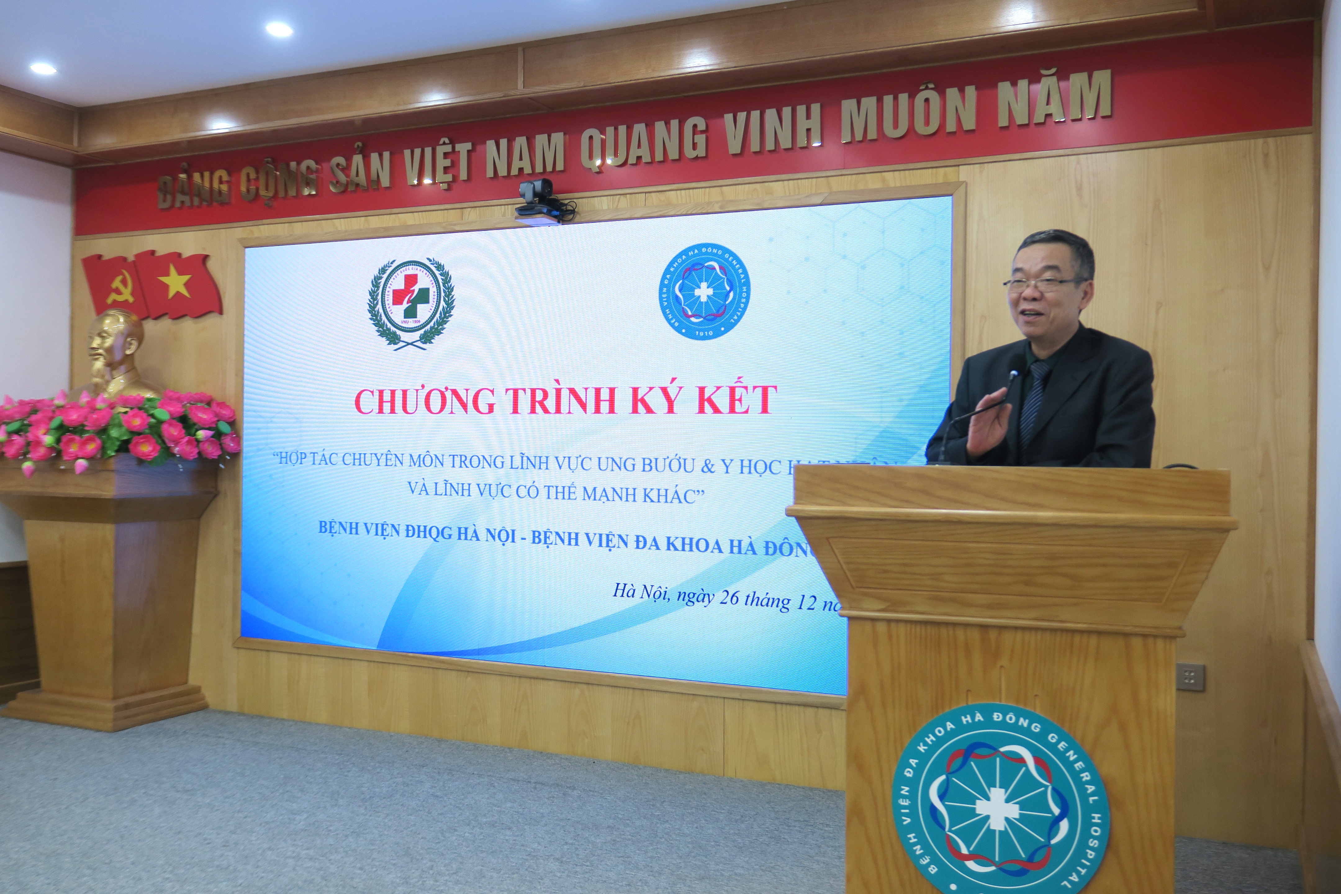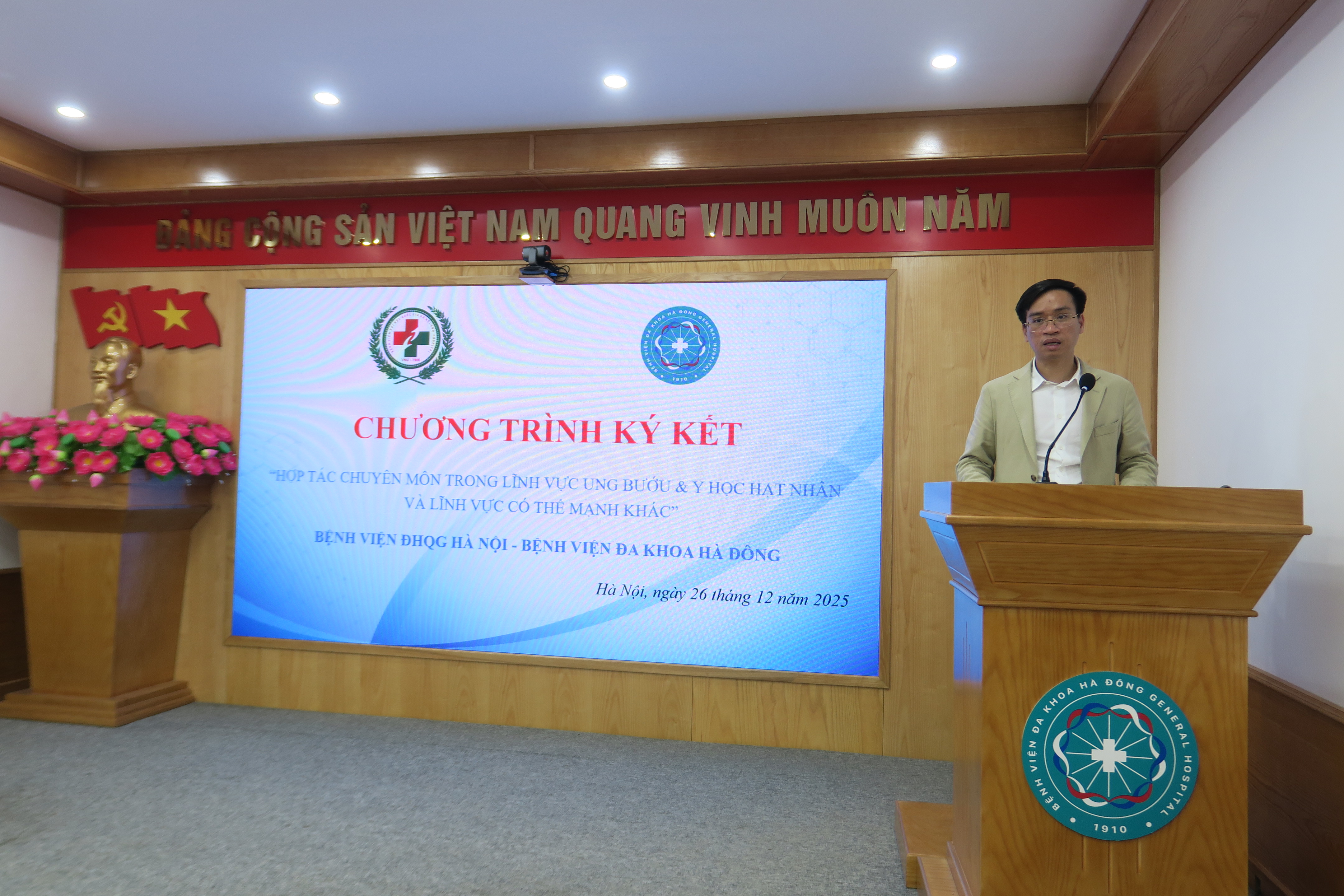 Nhằm không ngừng nâng cao chất lượng khám, chữa bệnh, mở rộng khả năng tiếp cận các kỹ thuật y học hiện đại cho người dân, chiều ngày 26/12/2025, Bệnh viện Đa khoa Hà Đông đã chính thức ký kết chương trình “Hợp tác chuyên môn trong lĩnh vực Ung bướu & Y học hạt nhân và các lĩnh vực có thế mạnh khác” với Bệnh viện Đại học Quốc gia Hà Nội (ĐHQG Hà Nội).