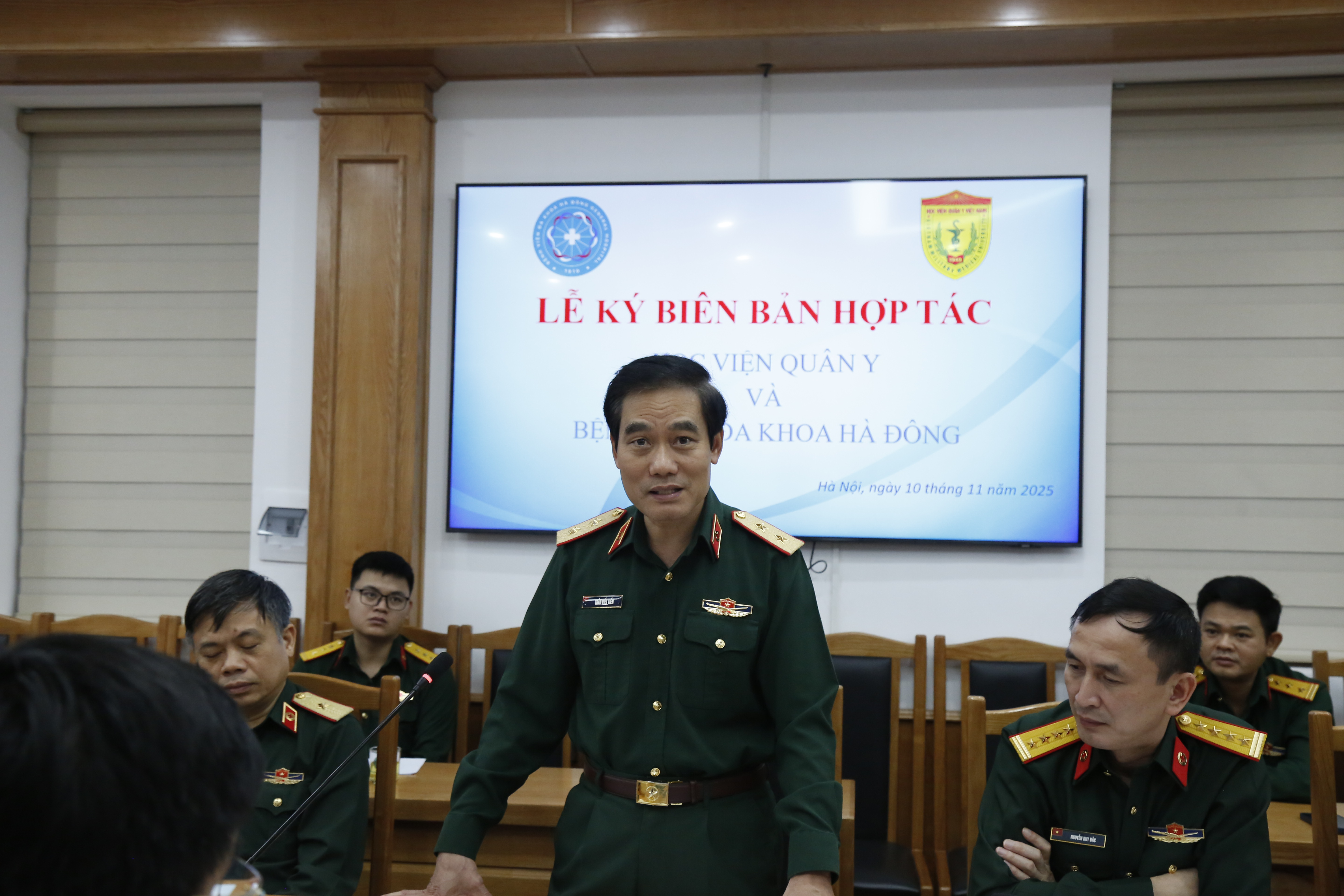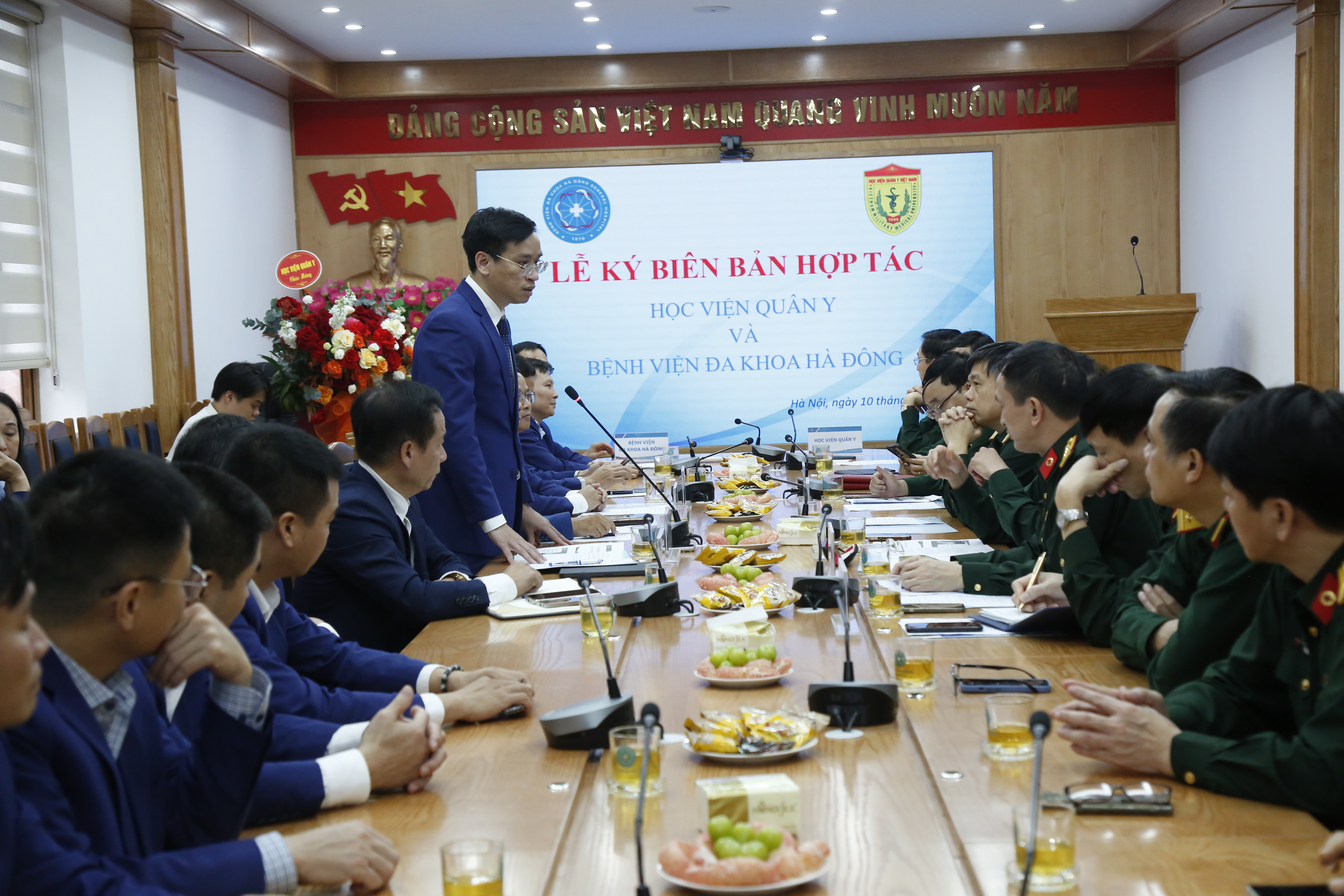 Phát biểu tại buổi lễ Trung tướng GS.TS Trần Việt Tiến Giám đốc Học viện đánh giá cao những kết quả hợp tác giữa Học viện Quân y và Bệnh viện Đa khoa Hà Đông trong thời gian qua. Đồng chí khẳng định, mối quan hệ phối hợp giữa hai đơn vị đã góp phần quan trọng trong việc nâng cao chất lượng đào tạo, chuyển giao kỹ thuật và chăm sóc sức khỏe nhân dân.