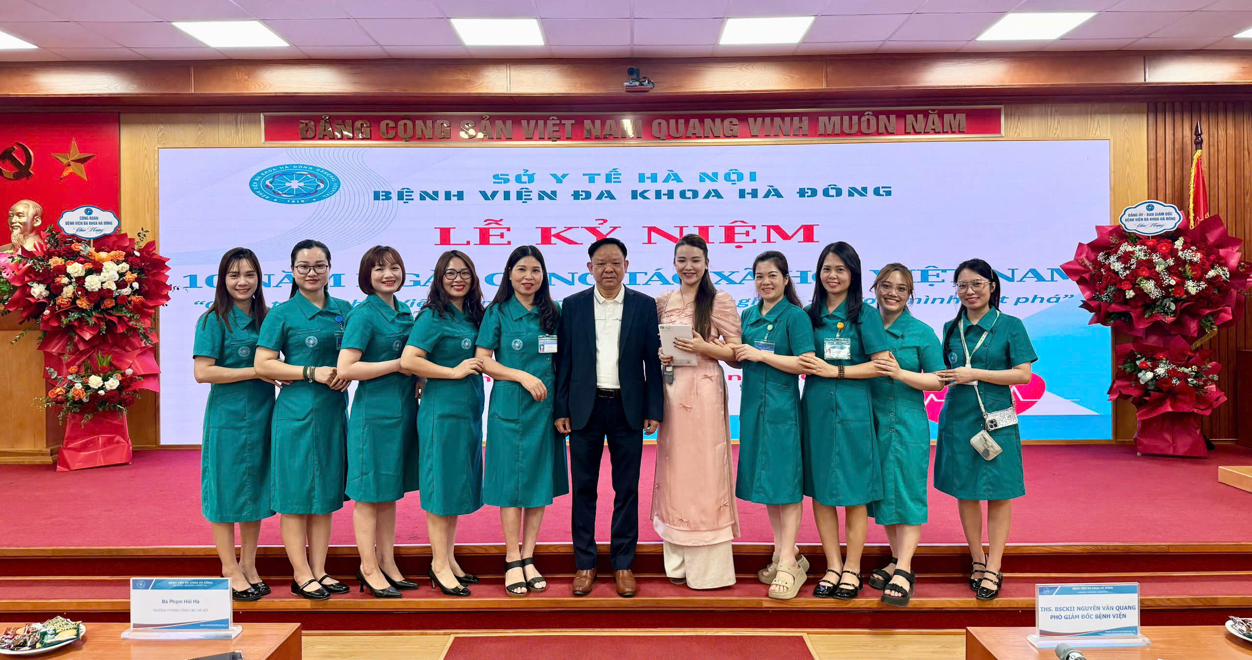 Chiều ngày 25/3/2026, phòng CTXH, Bệnh viện đa khoa Hà Đông đã long trọng tổ chức lễ kỷ niệm 10 năm ngày Công tác xã hội Việt Nam (25/3/2016-25/3/2026) với sự tham dự của BSKII. Nguyễn Văn Quang – Phó giám đốc bệnh viện, BSCKII. Nguyễn Thị Thùy Dương – Chủ tịch Công đoàn bệnh viện cùng đại diện các khoa/phòng, mạng lưới công tác xã hội và các đơn vị tài trợ đồng hành.