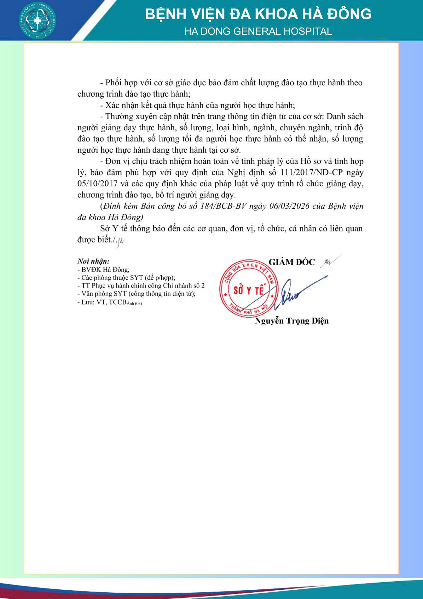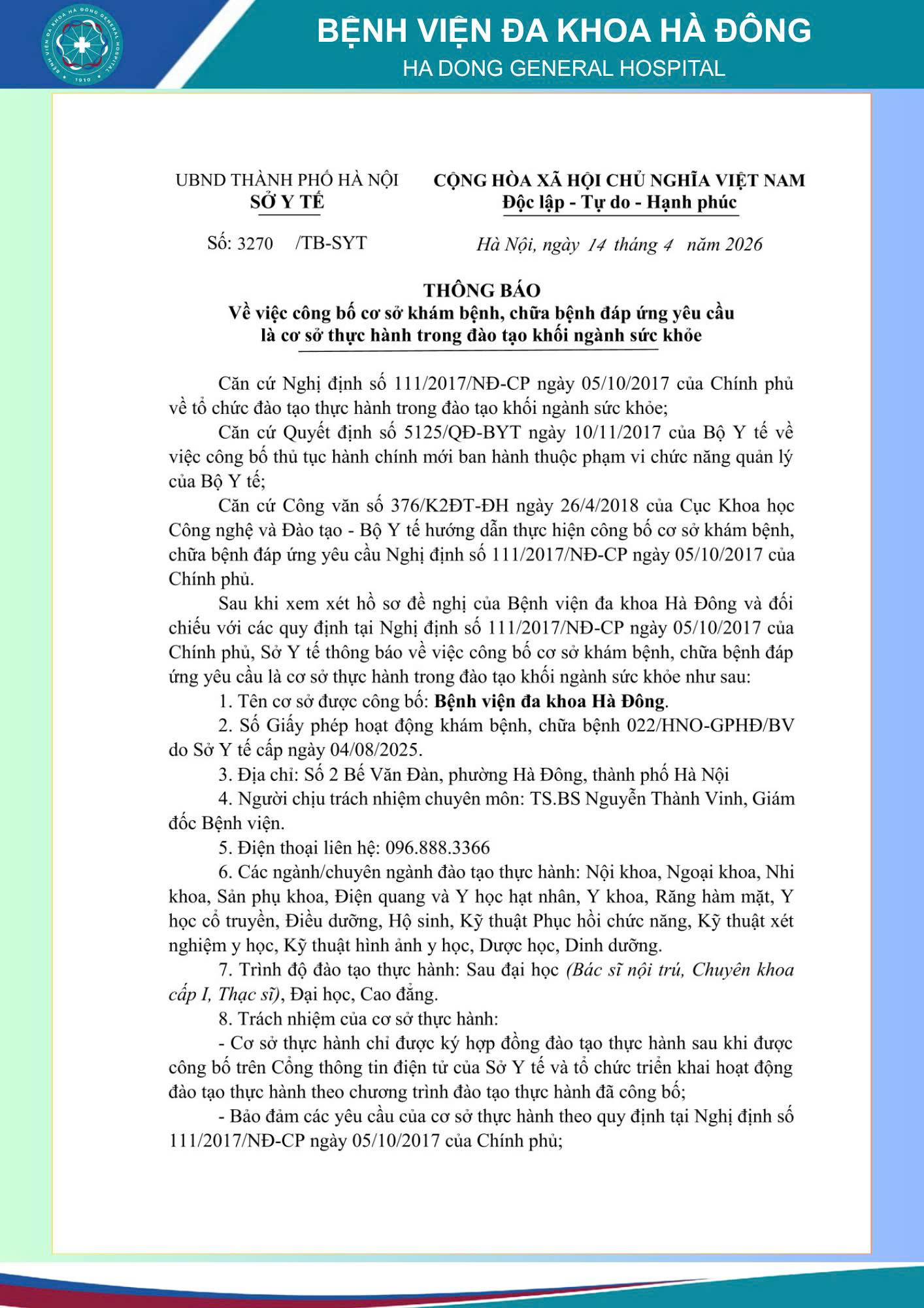 Ngày 14/4/2026, Sở Y tế Hà Nội đã ban hành Thông báo số 3270/TB-SYT về việc công bố Bệnh viện Đa khoa Hà Đông là cơ sở khám bệnh, chữa bệnh đáp ứng đầy đủ yêu cầu để trở thành cơ sở thực hành trong đào tạo khối ngành sức khỏe.