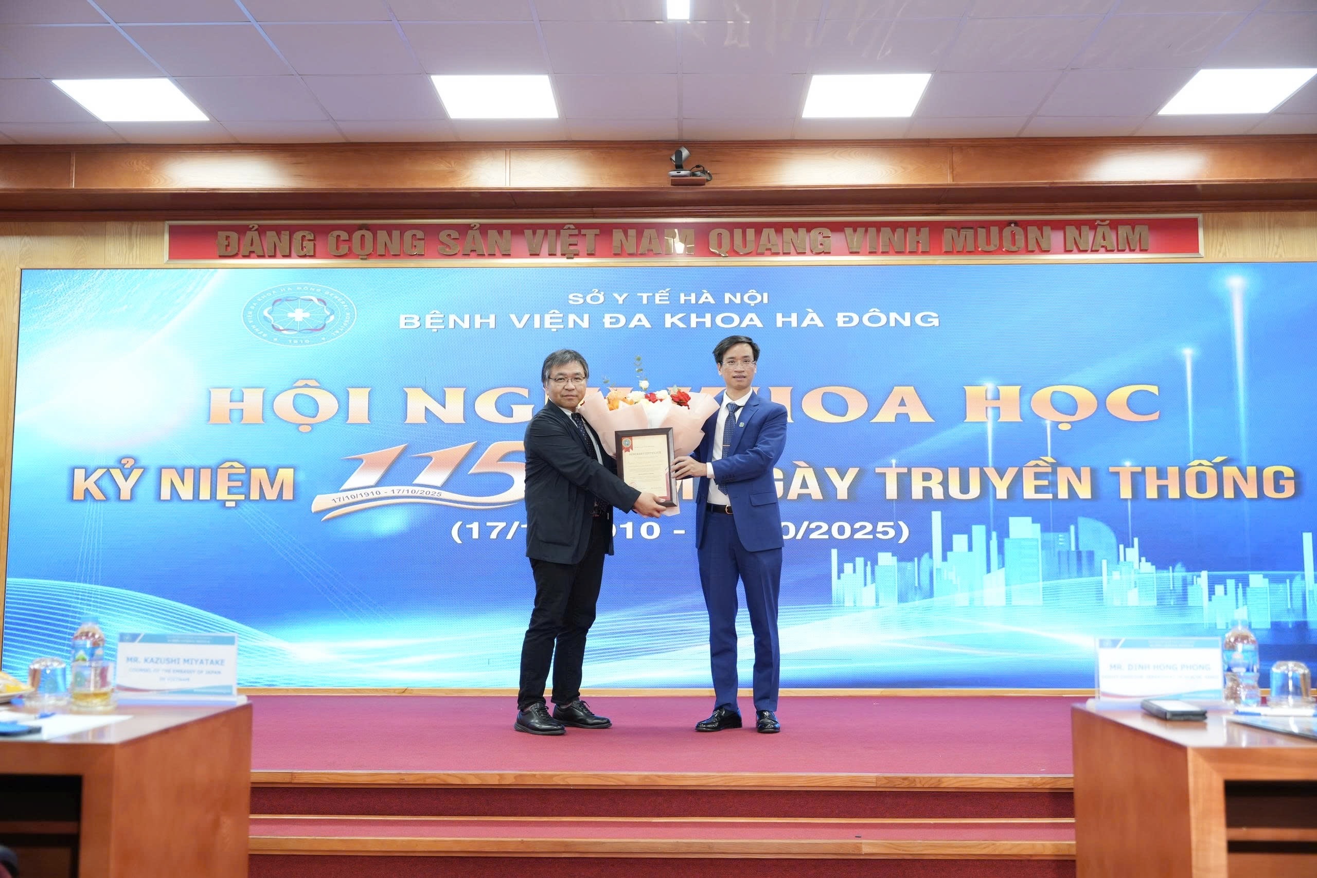 Trong buổi lễ, Ban lãnh đạo Bệnh viện Đa khoa Hà Đông đã trao chứng nhận Cố vấn danh dự cho ông Miyata Setsuya – chuyên gia y tế người Nhật Bản có nhiều năm kinh nghiệm trong lĩnh vực chăm sóc sức khỏe và hợp tác quốc tế. “Việc trao tặng chứng nhận không chỉ là sự ghi nhận những đóng góp tích cực của ông Miyata Setsuya, mà còn thể hiện cam kết lâu dài của bệnh viện trong việc duy trì và phát triển mối quan hệ hợp tác chiến lược với các chuyên gia, tổ chức y tế quốc tế.” – Đại diện bệnh viện chia sẻ.