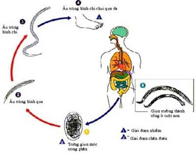 • Trứng giun móc, mỏ từ người nhiễm theo phân ra môi trường, phát triển thành ấu trùng (filariform) trong đất; ấu trùng xâm nhập qua da (thường lòng bàn chân khi đi chân đất) hoặc qua tiêu hóa (ít gặp hơn với một số loài). Trưởng thành cư trú ở ruột non, hút máu gây thiếu máu .