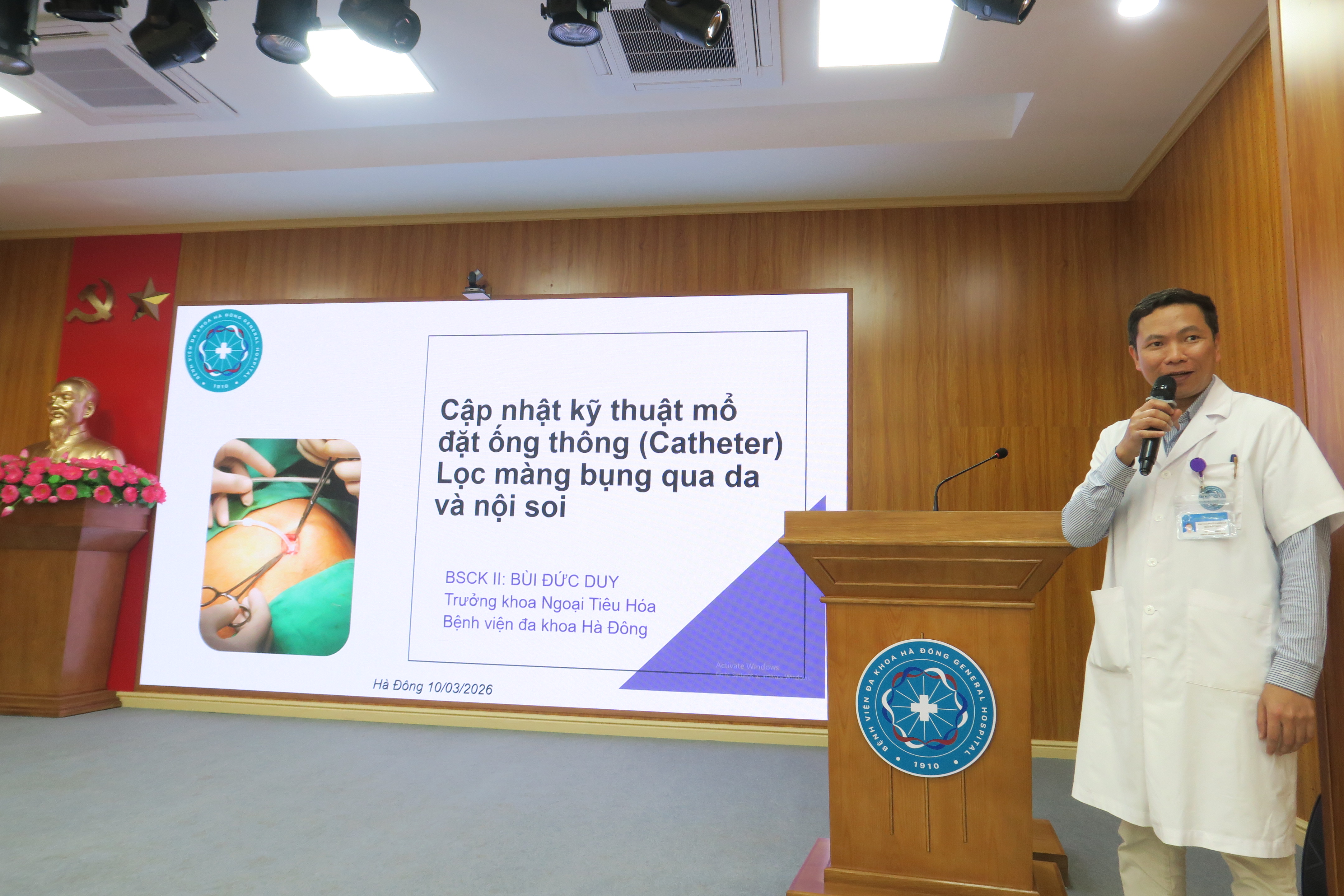 BSCKII Bùi Đức Duy – Trưởng khoa Ngoại tiêu hóa trình bày chuyên đề “Cập nhật kỹ thuật mổ đặt ống thông (catheter) lọc màng bụng qua da và nội soi”, gồm các nội dung Bệnh thận mạn và các phương pháp điều trị; các kỹ thuật mổ đặt ống lọc màng bụng; các lưu ý khi phẫu thuật lọc màng bụng.