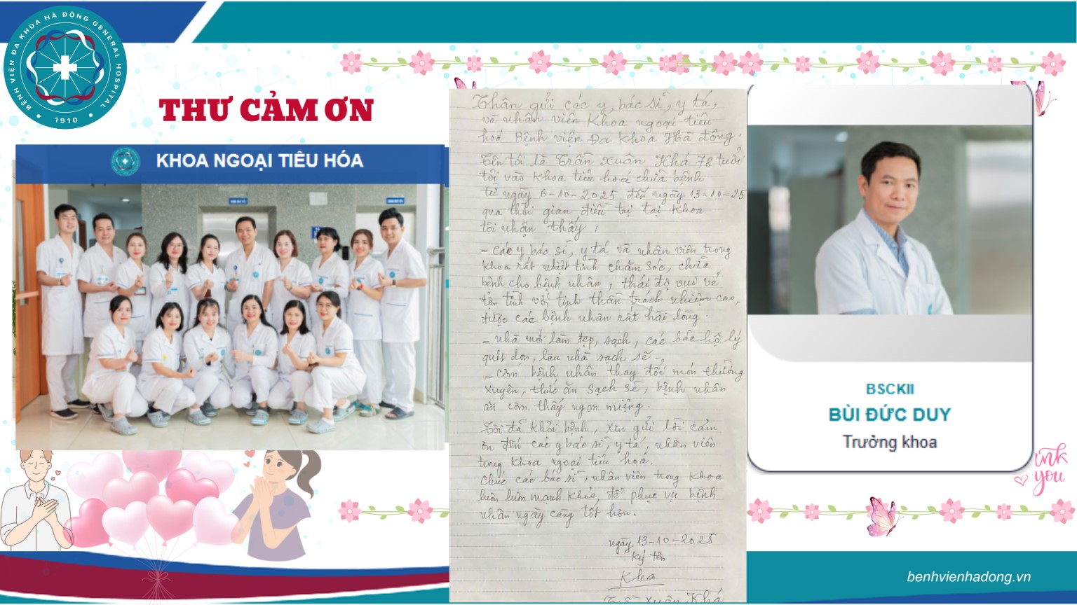 Mỗi lá thư cảm ơn, mỗi nụ cười bình phục là minh chứng cho sứ mệnh “Tất cả vì người bệnh thân yêu” – giá trị mà tập thể Khoa Ngoại Tiêu hóa luôn trân trọng và gìn giữ mỗi ngày.