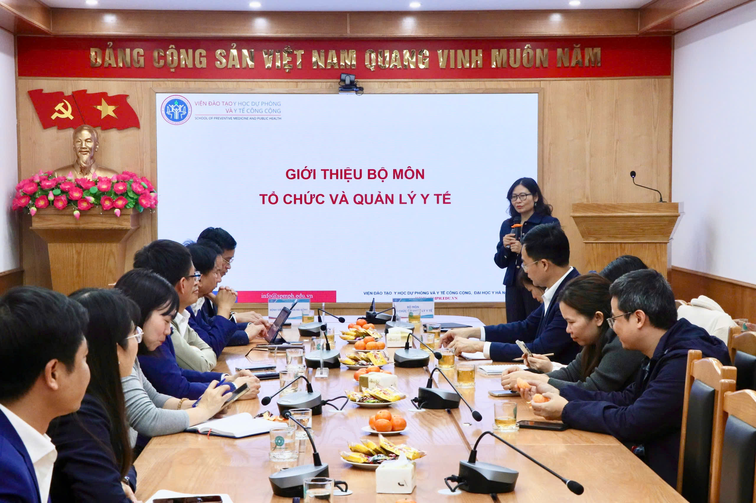 PGS.TS Nguyễn Thị Hoài Thu – Trưởng Bộ môn Tổ chức và Quản lý Y tế đã giới thiệu khái quát về Viện Đào tạo Y học Dự phòng và Y tế Công cộng