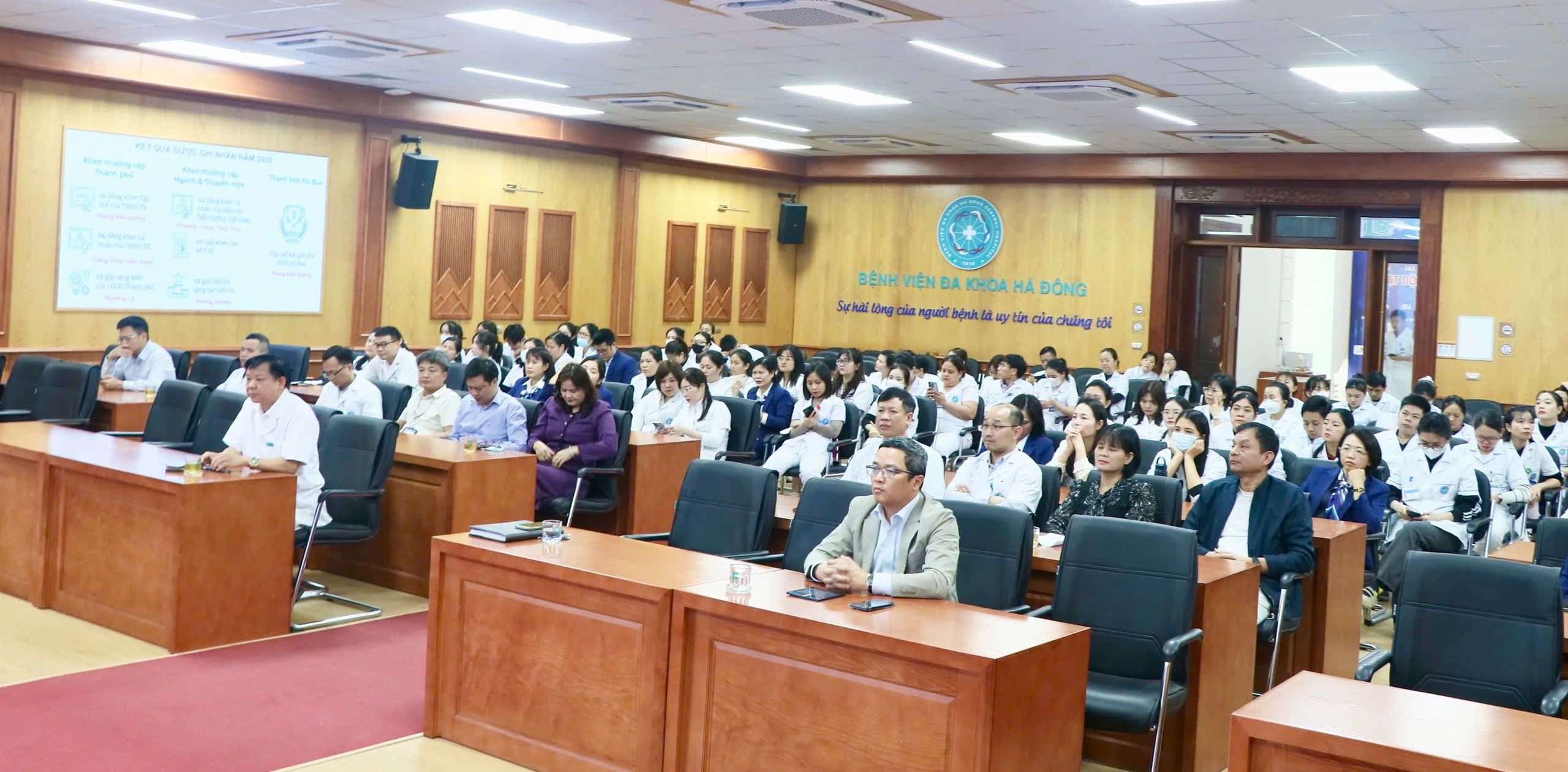 Chiều ngày 16/01/2026, tại Hội trường 4 – Bệnh viện Đa khoa Hà Đông đã tổ chức Hội nghị Tổng kết hoạt động Điều dưỡng năm 2025 và phương hướng nhiệm vụ năm 2026. Hội nghị có sự tham dự của Ths.BSCKII. Nguyễn Văn Quang – Phó bí thư Đảng ủy – Phó giám đốc Bệnh viện; Ths.BSCKII.Nguyễn Vũ Trung – Phó giám đốc Bệnh viện cùng lãnh đạo các khoa, phòng; 100% Điều dưỡng trưởng và đại diện điều dưỡng, hộ sinh, kỹ thuật y trong toàn bệnh viện.